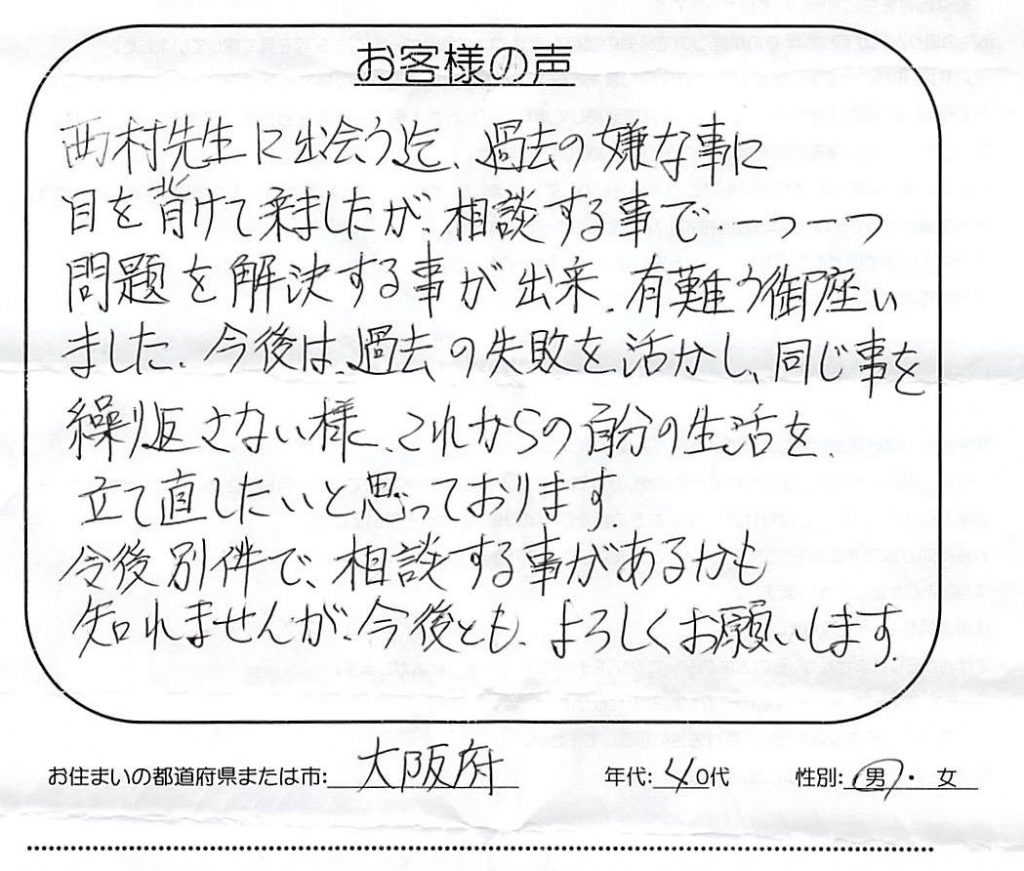 西村先生に出会う迄、過去の嫌な事に目を背けて来ましたが、相談する事で、一つ一つ問題を解決することが出来、有難う御座いました。 今後は過去の失敗を活かし、同じ事を繰り返さない様、これからの自分の生活を立て直したいと思っております。 今後別件... -