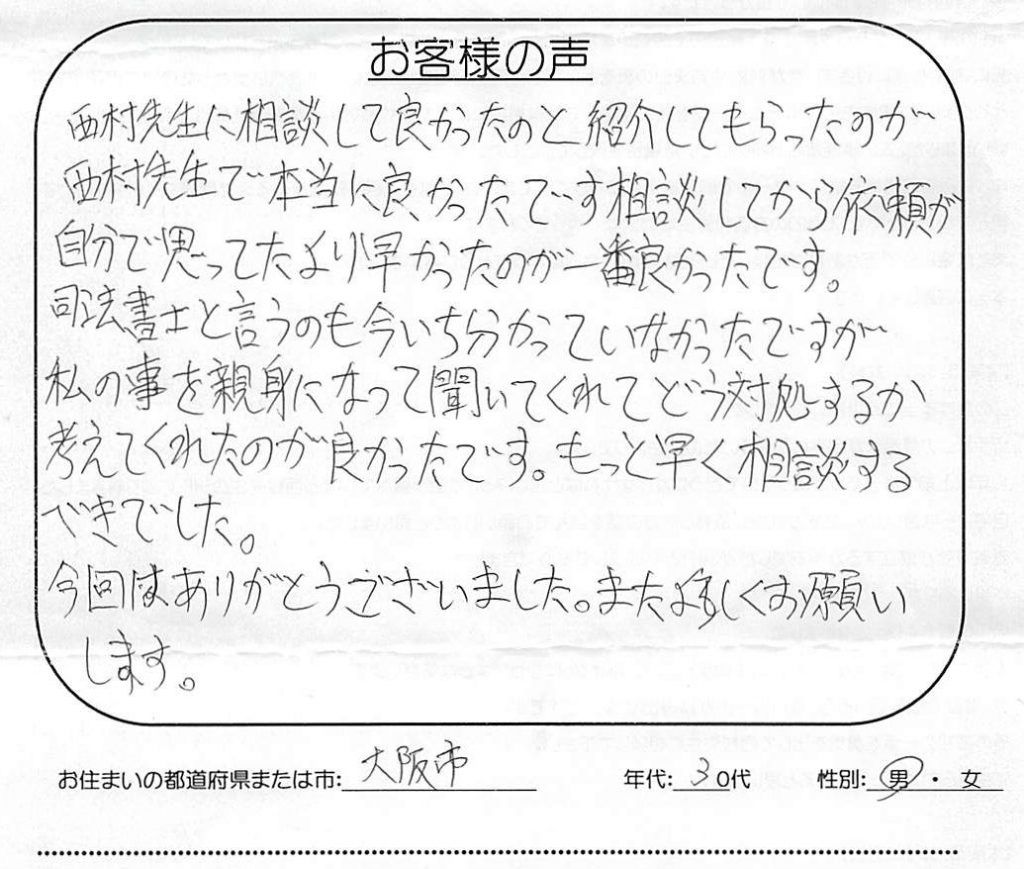 【アイアール債権回収の時効援用】口コミ・体験談「早急に解決して頂き ありがとうございました」(寝屋川市 50代 男性)No.162