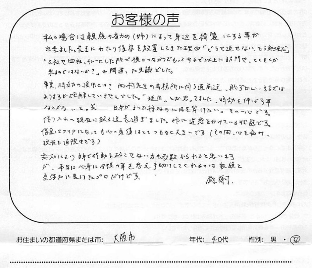 【アビリオ・アコム他の時効援用】口コミ・体験談「3社や4社キレーにした所で横のつながりで今まで以上に訪問や督促が来ると思っていました」(大阪市 40代 女性)No.232
