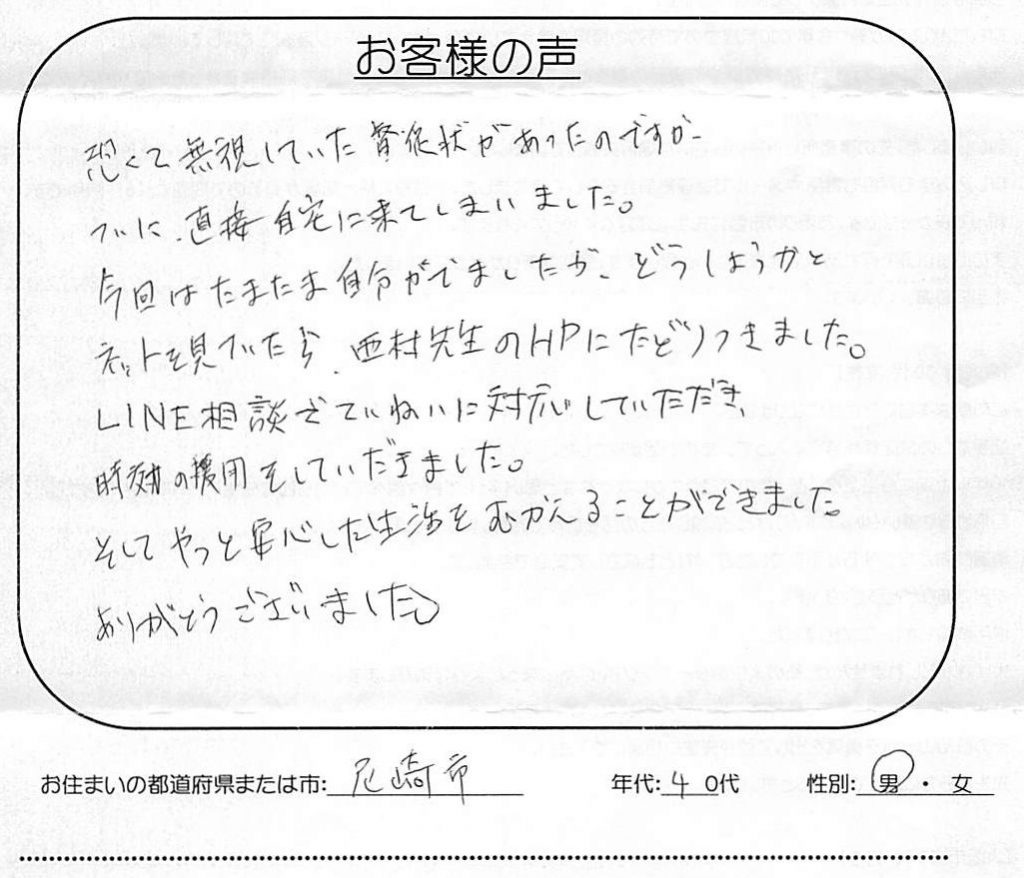 【アイフル・アコムの時効援用】口コミ・体験談「ついに、直接自宅に来てしまいました」(尼崎市 40代 男性)No.281