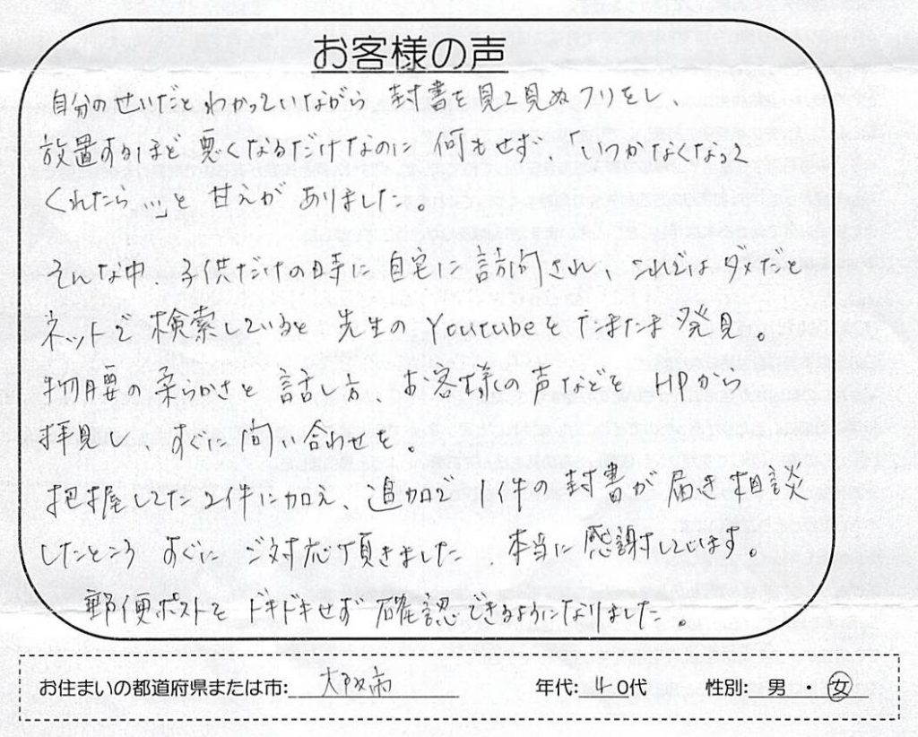 自分のせいだとわかっていながら封書を見て見ぬフリをし、放置するほど悪くなるだけなのに何もせず、「いつかなくなってくれたら・・・」と甘えがありました。 そんな中、子供だけの時に自宅に訪問され、これではダメだとネットで検索していると先生のYouT... -
