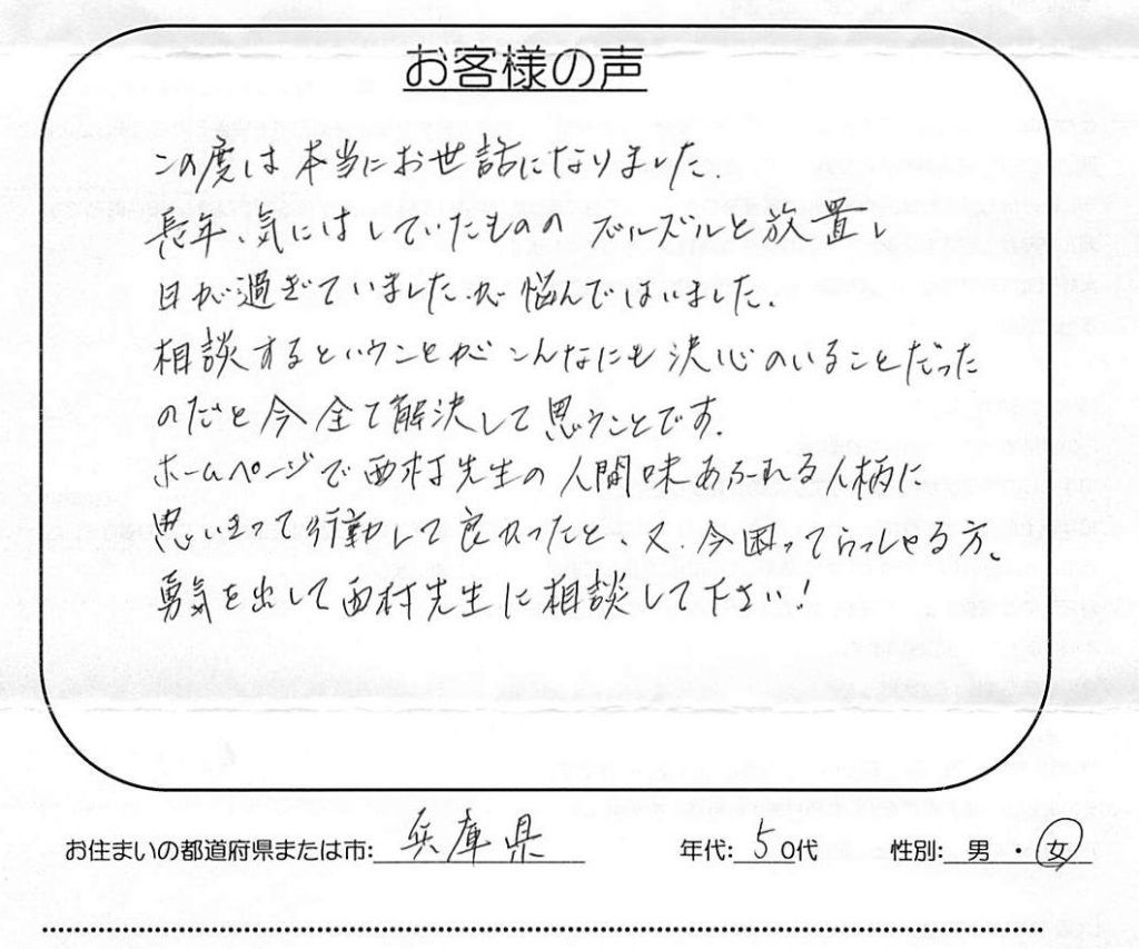 この度は本当にお世話になりました。 長年、気にはしていたもののズルズルと放置し 日が過ぎていました、が悩んではいました。 相談するということがこんなにも決心のいることだったのだと今全て解決して思うことです。 ホームページで西村先生の人間味あ... -