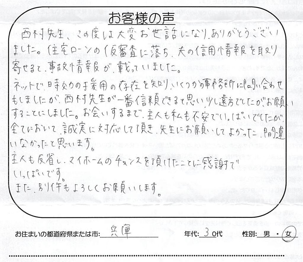 西村先生、この度は大変お世話になり、ありがとうございました。 住宅ローンの仮審査に落ち、夫の信用情報を取り寄せると、事故情報が載っていました。 ネットで時効の援用の存在を知り、いくつかの事務所に問い合わせもしましたが、西村先生が一番信頼で... -