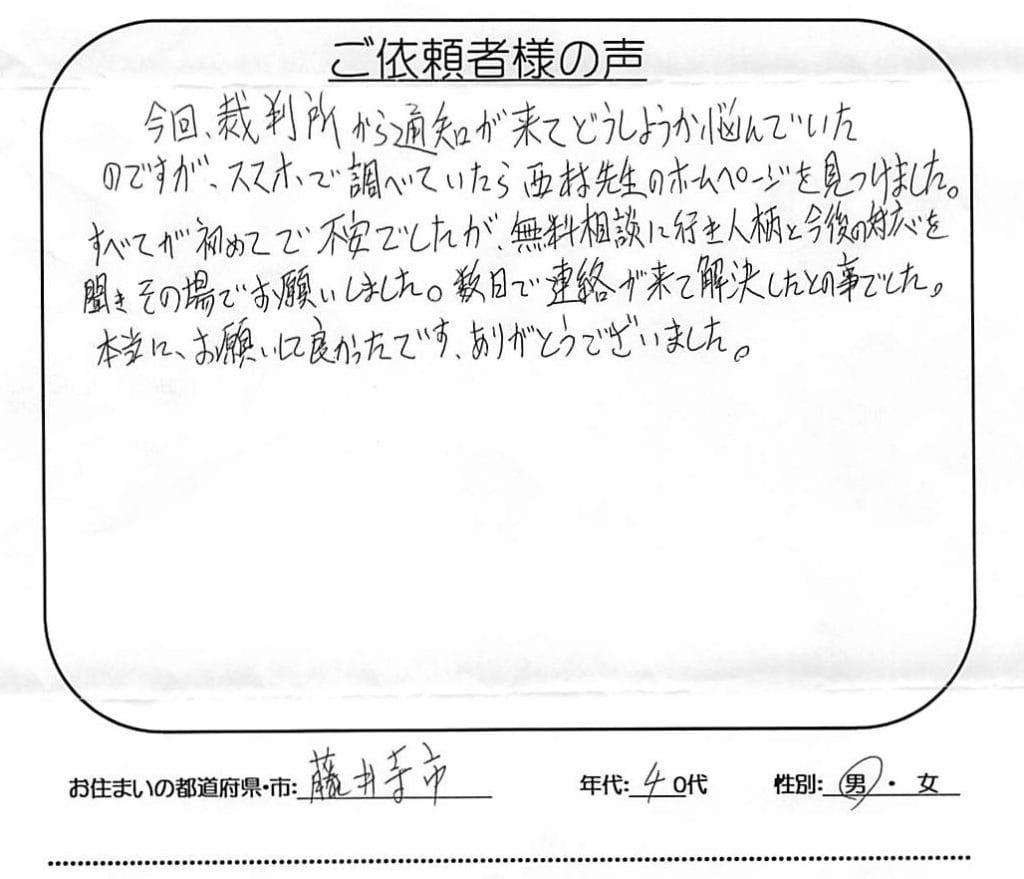 今回、裁判所から通知が来てどうしようか悩んでいたのですが、スマホで調べていたら西村先生のホームページを見つけました。 すべてが初めてで不安でしたが、無料相談に行き人柄と今後の対応を聞きその場でお願いしました。 数日で連絡が来て解決したとの... -