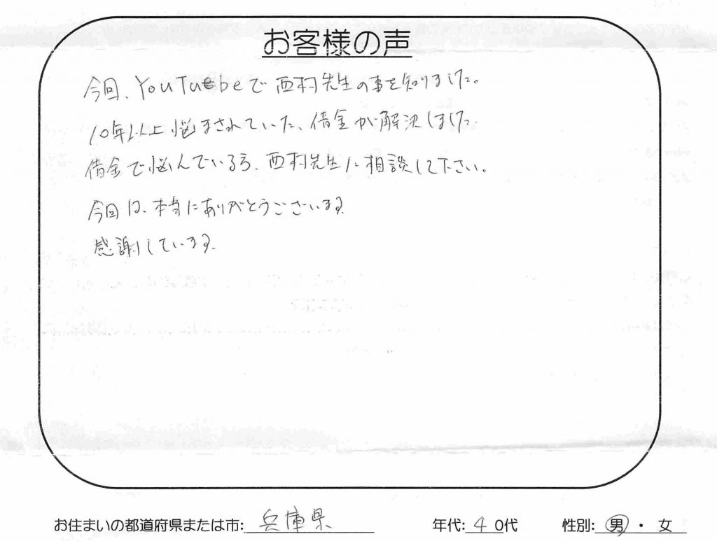 【引田法律事務所・日本保証の時効援用】口コミ・体験談「10年以上悩まされていた借金が解決しました」(兵庫県 40代 男性)No.243