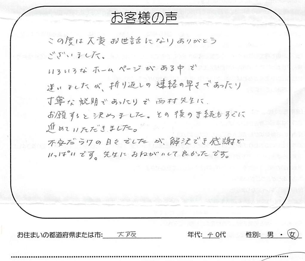この度は大変お世話になりありがとうございました。 いろいろなホームページがある中で迷いましたが、折り返しの連絡の早さであったり丁寧な説明であったりで西村先生にお願いすると決めました。 その後の手続もすぐに進めていただきました。 不安だらけの... -