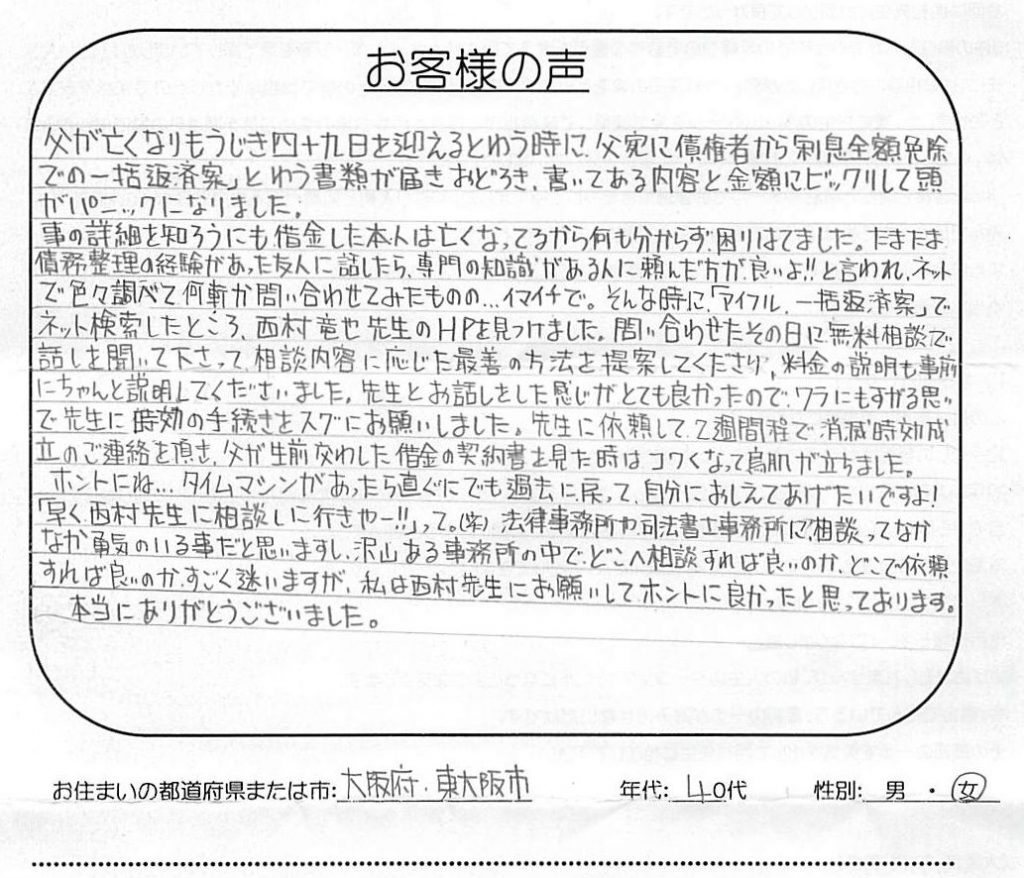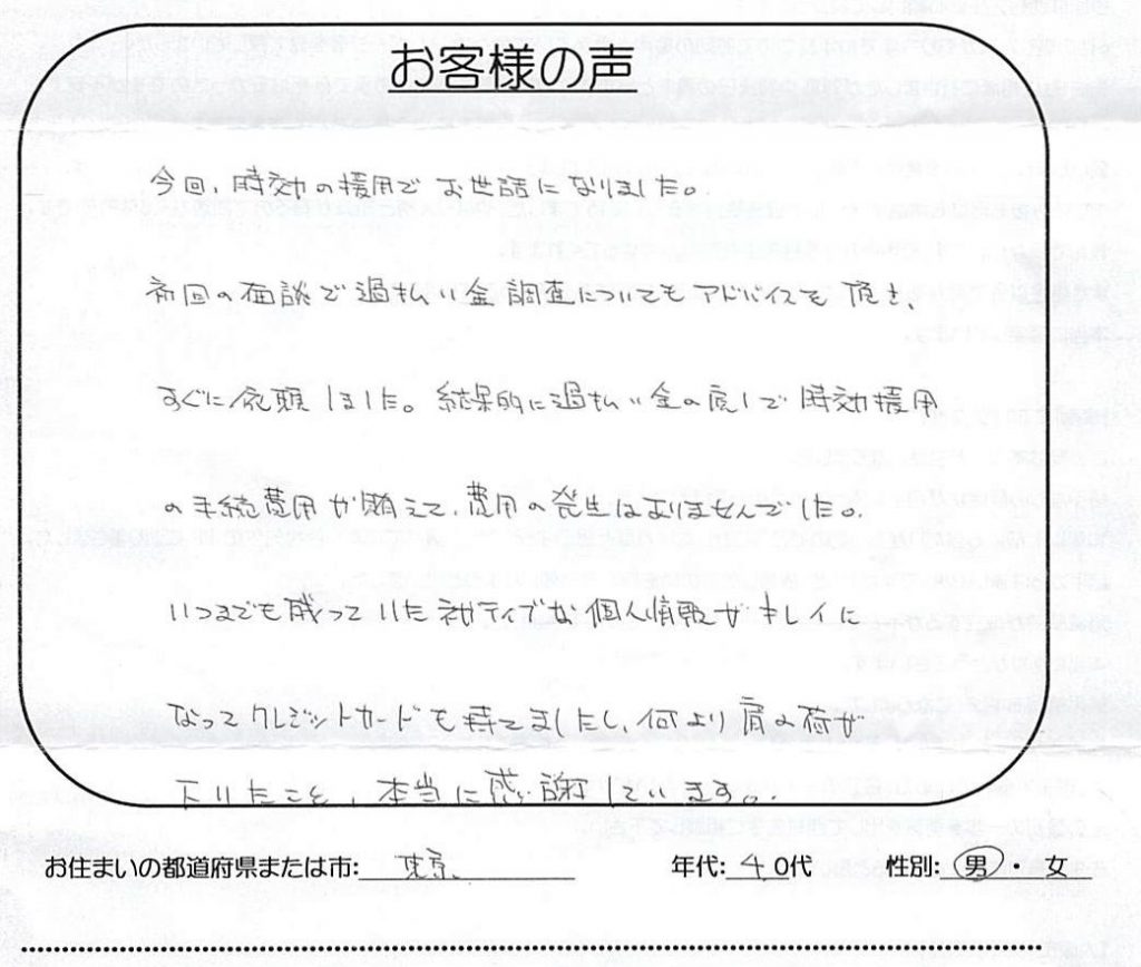 この度は、本当にお世話になりました。 今回、借金の通知書が届いてから、誰にも相談できず悩んでいました。 ネットで色々調べ、先生のHPを見て、電話させていただきました。 他県に住んでいた為、メールでのやり取りでしたが親切に対応していただき、無... -