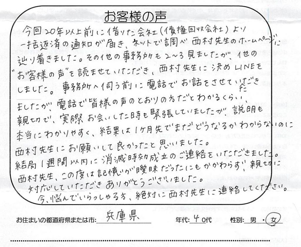 【引田法律事務所・日本保証の時効援用】口コミ・体験談「不安の中、分かり易く説明して頂けた事は心強いものでした」(兵庫県 40代 男性)No.255