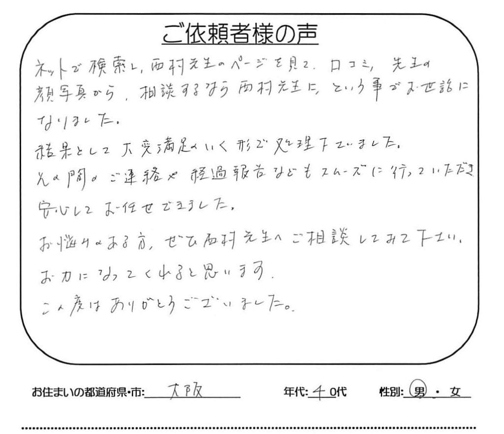 ネットで検索し、西村先生のページを見て、口コミ、先生の顔写真から、相談するなら西村先生に、という事でお世話になりました。 結果として大変満足のいく形で処理下さいました。 その間のご連絡や経過報告などもスムーズに行っていただき安心してお任せ... -