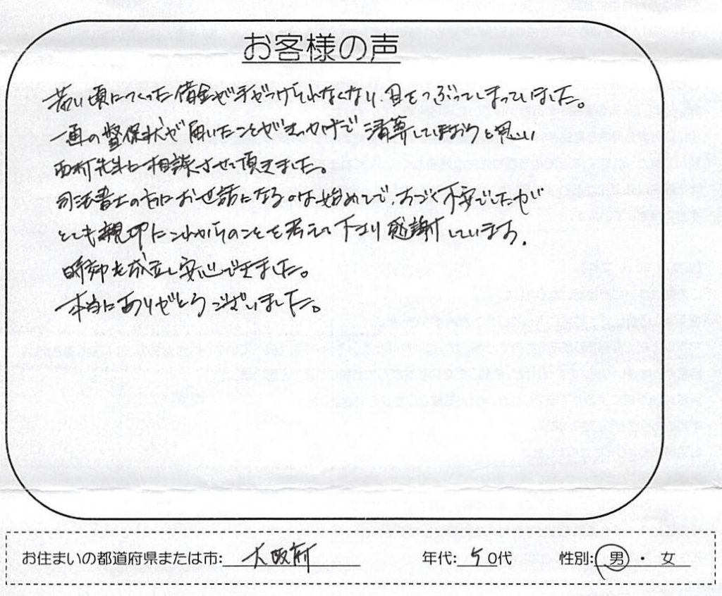 【引田法律事務所・日本保証の時効援用】口コミ・体験談「ご丁寧に対応して頂き、お世話になりました」(八尾市 40代 男性)No.274