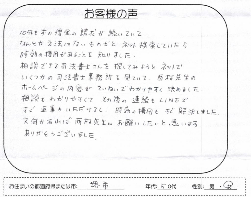 大阪にはたくさんの司法書士・弁護士事務所がありますが、多くのHPを比較した上で、当事務所に時効の援用を依頼されたお客様の声です。