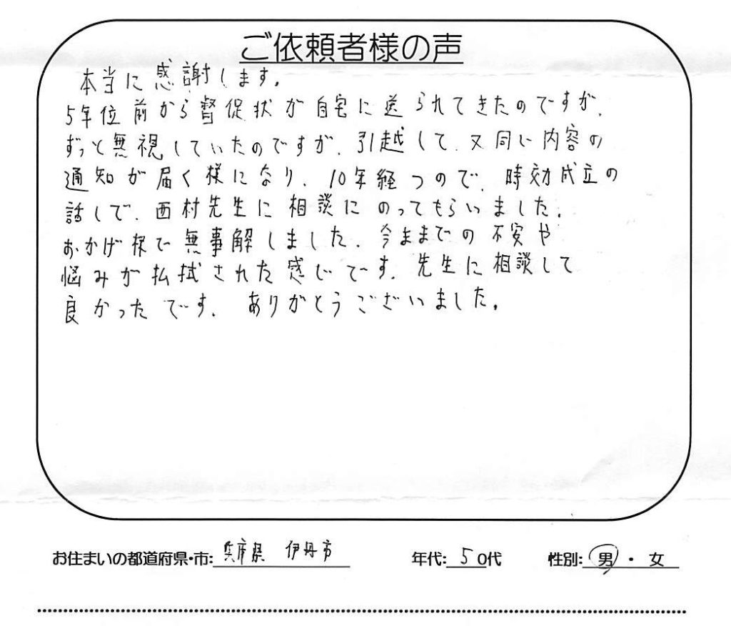 この度は、本当にお世話になりました。家に督促状が届いて、最初は、不安でどうして良いかわからず頭をかかえていました。そこで思いきって司法書士さんに相談しようとHPを開いて見つけたのが西村先生のHPでした。初めての事なので最初は「消滅時効が成立...