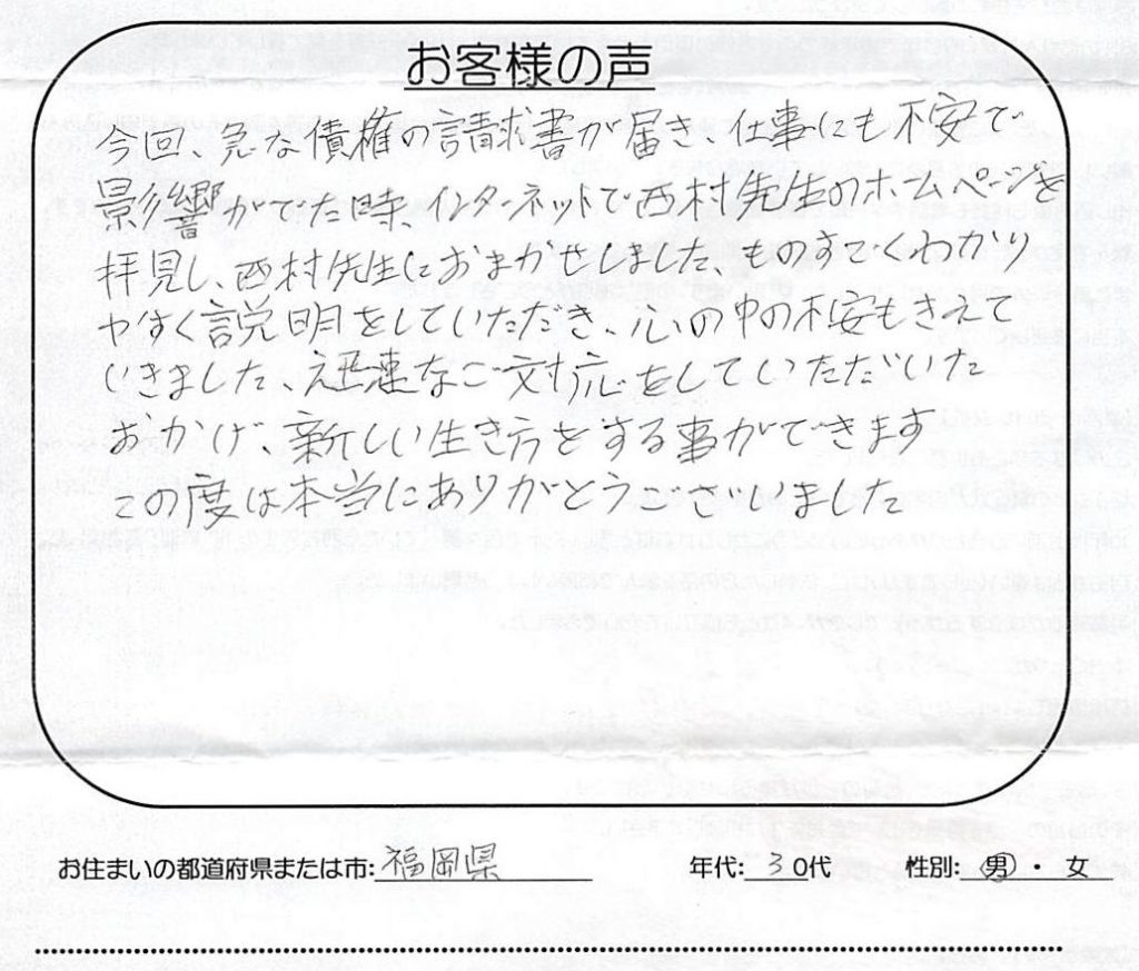 今回、急な債権の請求書が届き、仕事にも不安で影響がでた時、インターネットで西村先生のホームページを拝見し、西村先生におまかせしました、 ものすごくわかりやすく説明をしていただき、心の中の不安もきえていきました、 迅速なご対応をしていただい... -