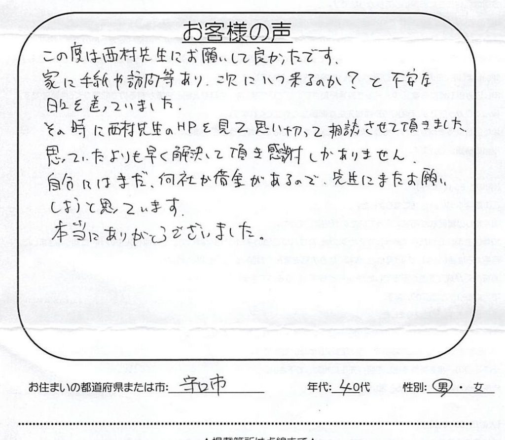 この度は西村先生にお願いして良かったです。 家に手紙や訪問等があり、次にいつ来るのか?と不安な日々を送っていました。 その時に西村先生のHPを見て思い切って相談させていただきました。 思っていたよりも早く解決して頂き感謝しかありません。 自分... -